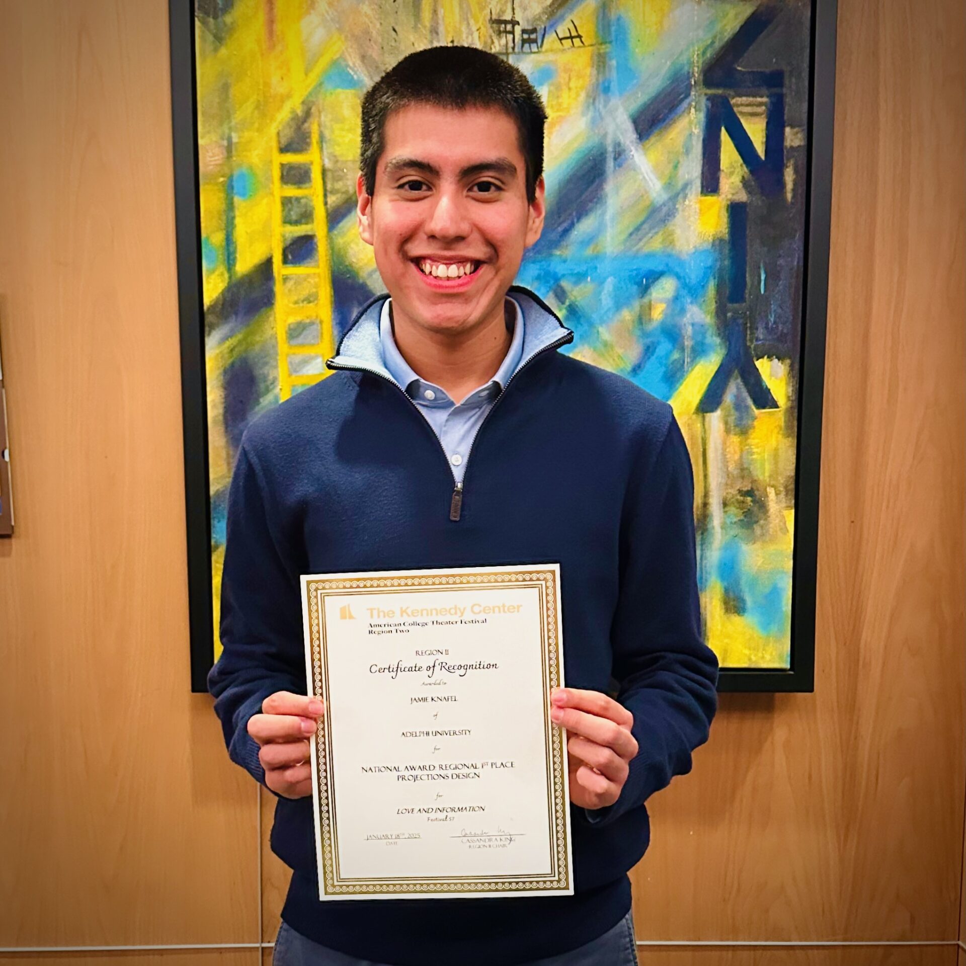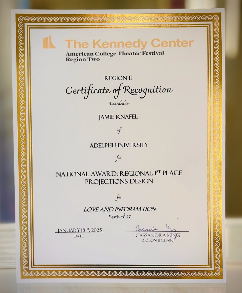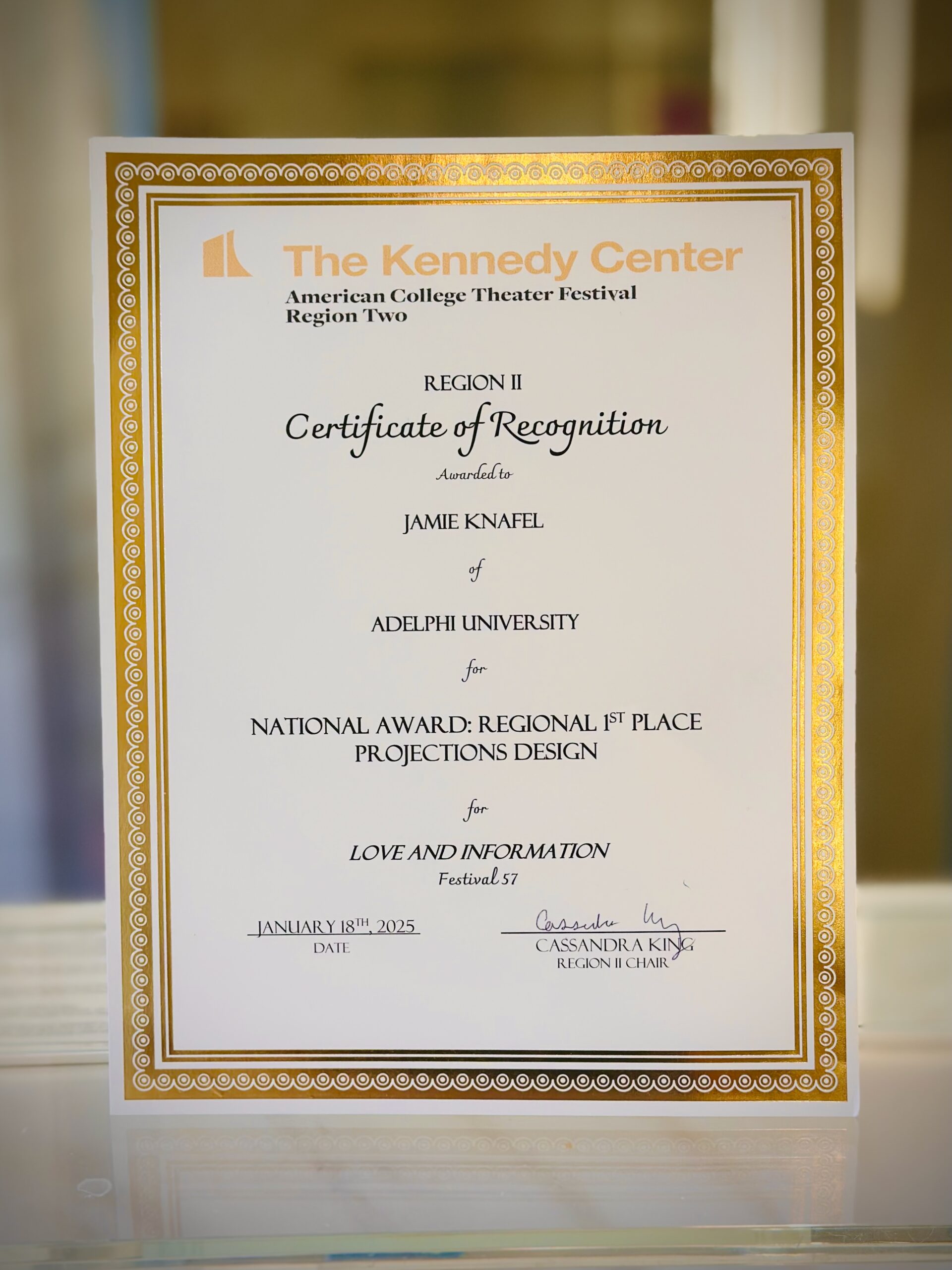 I traveled with a small group of Adelphi University students to the Kennedy Center American College Theater Festival in Pittsburgh, a national program that brings together thousands of college theater students to showcase and compete in categories such as acting, musical theater, and technical design. I competed in the Design, Technology, and Management category, presenting my projections design for Adelphi’s production of Love and Information (Caryl Churchill), and was honored to receive First Place in Projections Design. This recognition for this award was a sponsored trip to the United States Institute of Theater Technology and Entertainment (USITT) conference in Columbus, Ohio, where my work was displayed along with eight other awarded students. At USITT, I participated in master classes, networked with professionals from major entertainment organizations, and watched incredible live event shows, gaining valuable insight to the live entertainment industry.